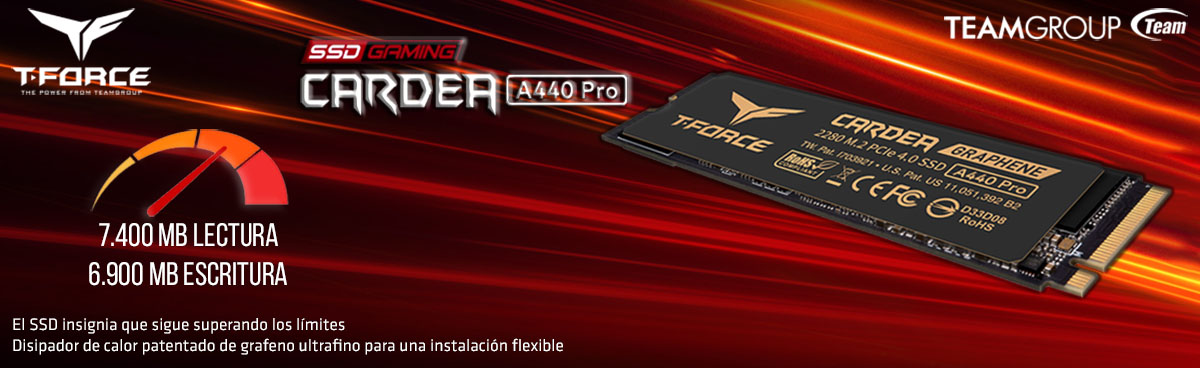 TEAMGROUP T-FORCE SSD CARDEA A440 PRO M.2 PCIeCARACTERÍSTICASEl nuevo y mejorado disipador de calor tipo aleta de aluminio especial puede reducir efectivamente la temperatura en un 48 % y retrasar la caída de velocidad. El SSD insignia que sigue superando los límites Disipador de calor patentado de grafeno ultrafino para una instalación flexible Dos...