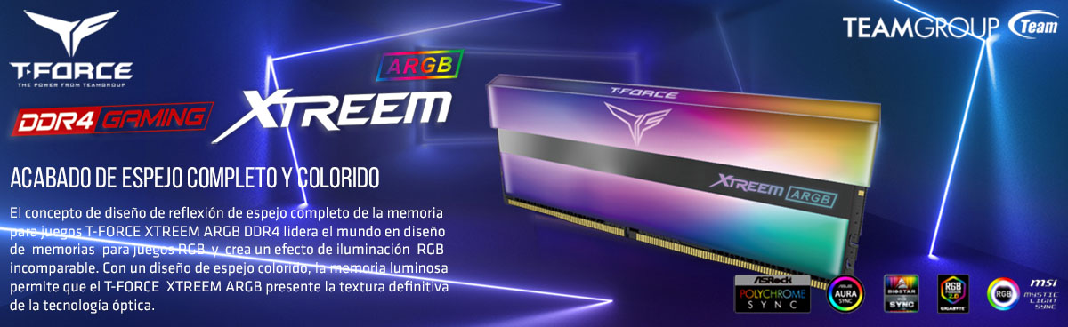 TEAMGROUP T-FORCE XTREEM ARGB DDR4 (BLACK) 32GB (16GBx2) CARACTERÍSTICASPenetración total de la luz del espejo. Última tecnología ARGB Disipador de calor de aleación de aluminio de alto rendimiento. Soporta placas base Intel y AMD IC seleccionado de alta calidad Soporte de perfil OC