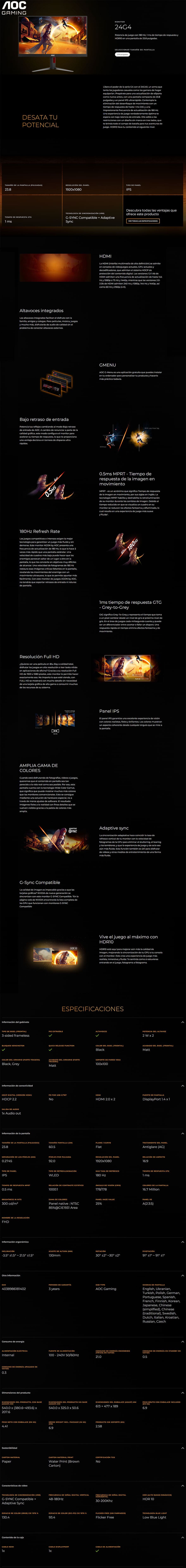 Sumérgete por completo en la acción con el nuevo monitor AOC GAMING 24G4. Diseñado para los jugadores más exigentes, este monitor de 23.8 pulgadas cuenta con un panel IPS de alta calidad que no solo reproduce colores precisos y vivos, sino que también ofrece ángulos de visión de 178°, asegurando una imagen perfecta desde cualquier perspectiva. Rendimiento de Élite para Gaming Competitivo Con una impresionante tasa de refresco de 180Hz, el 24G4 actualiza la imagen 180 veces por segundo, lo que se traduce en un movimiento increíblemente suave y sin interrupciones.