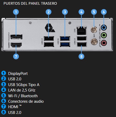 | USB | 4x USB 2.0 (trasero) 4x USB 2.0 (frontal) 2x USB 5 Gbps tipo A (trasero) 2x USB 5 Gbps tipo A (frontal) 1x USB 10 Gbps tipo C (frontal) |