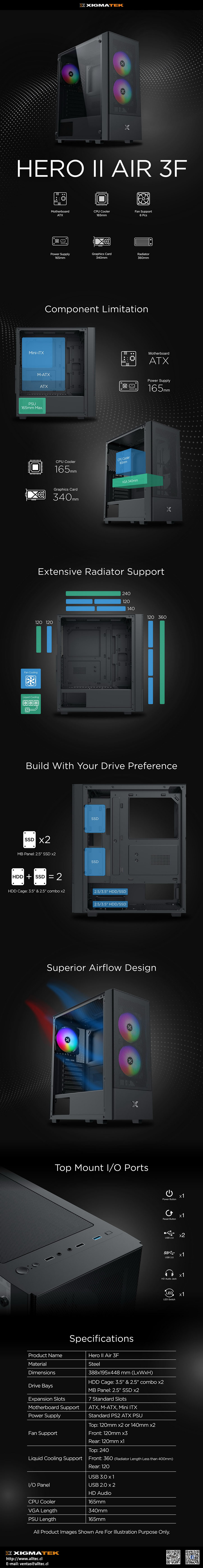 HERO II AIR 3F (ATX, U3x1 & U2x2, Front Meshed Grill & Left TG, 3PCS Z20F Fixed LED Fan)