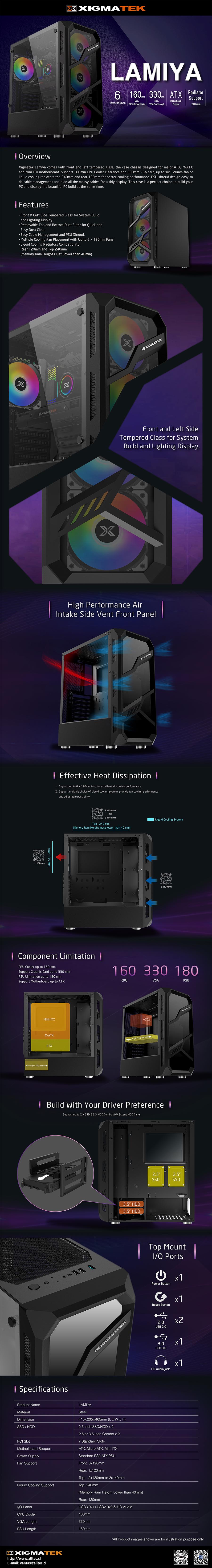 Xigmatek Lamiya viene con vidrio templado frontal e izquierdo, el chasis diseñado para las principales placas base ATX, M-ATX y Mini ITX. Admite un espacio libre para el refrigerador de la CPU de 160 mm y una tarjeta VGA de 330 mm, hasta seis ventiladores de 120 mm o radiadores de refrigeración líquida superiores de 240 mm y traseros de 120 mm para un mejor rendimiento de refrigeración. El diseño de la cubierta de la fuente de alimentación facilita la gestión de cables y oculta todos los cables desordenados para una pantalla ordenada. Este estuche es una opción perfecta para armar su PC y mostrar su hermosa estructura al mismo tiempo.